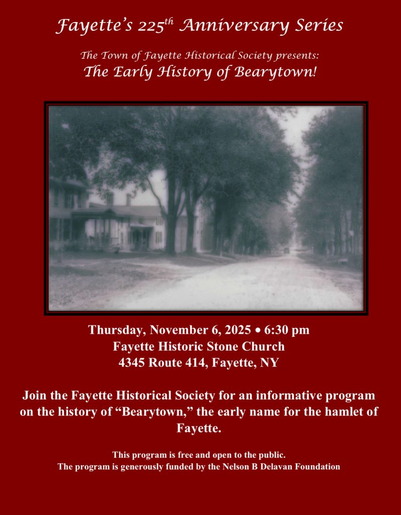 On November 6th at the Stone Church @ 6:30pm: Join the Fayette Historical Society for an informative program on the history of “Bearytown,” the early name for the hamlet of Fayette.