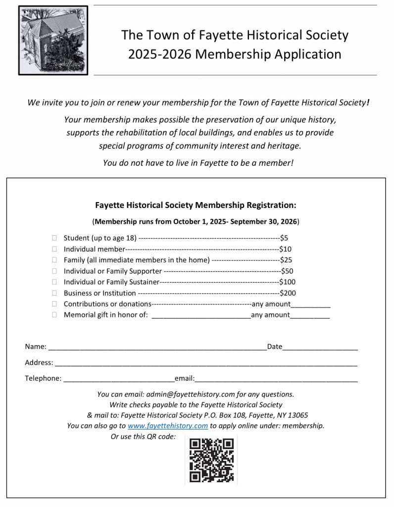 We invite you to join the Town of Fayette, NY’s Historical Society! As a member, you will be supporting the preservation of local artifacts and landmarks. You will be an active supporter of local history, have the opportunity to participate in living history, and get involved! (You do not have to live in Fayette to be a member.) We look forward to hearing from you!